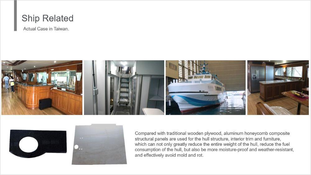 船舶應用對於重量以及耐候性十分要求,鋁蜂巢板不僅質量輕巧可大幅減輕船體重量外,也因耐候性佳,故不需擔心如木層板會遇到的蟲蛀及腐蝕等問題產生。